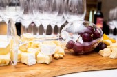 Płyta ser serwowane z białym winem, krakersy i orzechy, widok z góry. Różne sery Camembert, Brie, parmezan niebieski ser