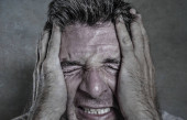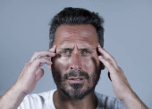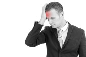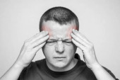 młody mężczyzna atrakcyjny i smutny, cierpienie ból głowy z ręki na głowie tempo w stres właśnie zdesperowany i chory na białym tle portret czarno-białe o powierzchni przedniej ból w kolorze czerwonym