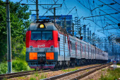 Rosyjski pociąg elektryczny na railsrussia, stacja Pargolovo, 8 maja 2018 r.