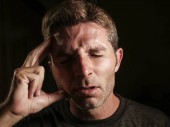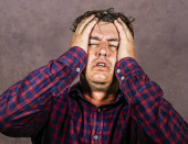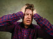 młody mężczyzna atrakcyjny i smutny cierpienie depresja i ból głowy z ręki na głowie tempo w stres właśnie martwi się i chory streszczenie na białym tle na tle w służbie zdrowia i pojęcie migreny