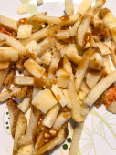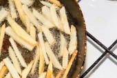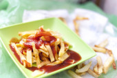 Smażone frytki z keczupem. Kawałki ziemniaków smażone na metal widelec. Niezdrowa dieta.