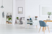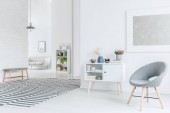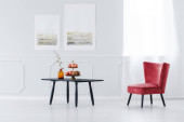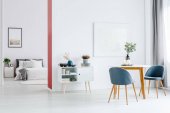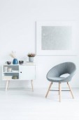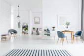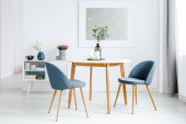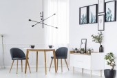 Szary krzesła przy stole drewniane białe ściany z srebrne malowanie w wnętrze mieszkania