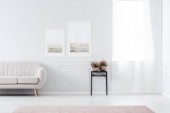 Prosta, biała sypialnia wnętrza z kwiatowy poduszkę i szary koc na łóżku