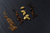 Różnych indyjskich przypraw i nasiona na ciemny kamień tabeli. Kolorowe przypraw kardamonu, kminek, ziele angielskie, czarny pieprz, widok z góry. Żywności ekologicznej, zdrowego stylu życia. Miejsca na tekst