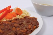 Tempeh z sosem pomidorowym i millets na drewnianym stole
