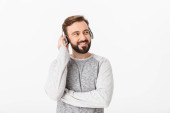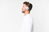 Wizerunek przystojny mężczyzna młody na białym tle nad biała ściana słuchania muzyki w tle ze słuchawkami.