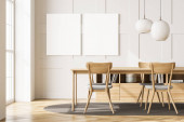 Zdjęcie "Wnętrze jadalnia z awalls biały, długi, drewniany stół i krzesła biały i drewniane posadzki betonowej. Koncepcja minimalizm. makiety 3D renderowania" może być wykorzystywane do celów osobistych i komercyjnych zgodnie z warunkami zakupionej licencji Royalty-free. Obraz jest dostępny do pobrania w jakości wysokiej rozdzielczości do 5760x3840.