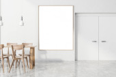 Wnętrze jadalnia z awalls biały, długi, drewniany stół i krzesła biały i drewniane posadzki betonowej. Koncepcja minimalizm. makiety 3D renderowania