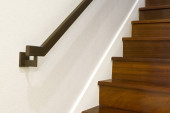 Zdjęcie "Pływające schody. Jesion drewna schody z poręczą przymocowane do brązowej ścianie i prowadzące do drugiego piętra wewnątrz stylowy nowoczesny dom" może być wykorzystywane do celów osobistych i komercyjnych zgodnie z warunkami zakupionej licencji Royalty-free. Obraz jest dostępny do pobrania w jakości wysokiej rozdzielczości do 5760x3840.