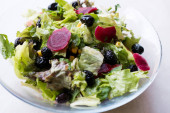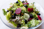 Portulaka: Sałatka z pomidorów i oliwki czarne Miski porcelanowe. Żywności ekologicznej.
