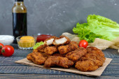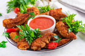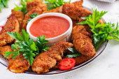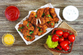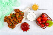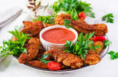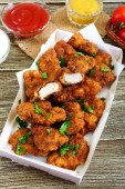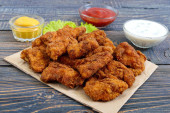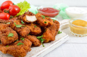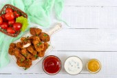 Nuggets z kurczaka. Kawałki mięsa chrupiące smażone w głębokim tłuszczu, na papierze z różnymi sosami na biały drewniany stół. Tradycyjne przekąski.