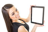 piękna blondynka interesu wyświetlone ekranem komputera typu tablet