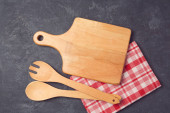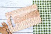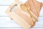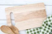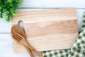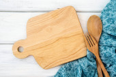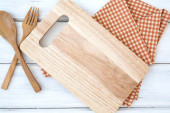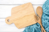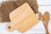 siekanie deski i obrus z drewnianym widelcem i łyżką na białym stole, przepisy żywności dla zdrowych nawyków shot note background concept