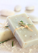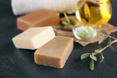 Naturalne mydła z ekstrakt z oliwek i solą morską na stole