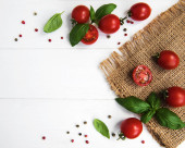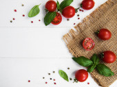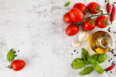 Składniki do gotowania, oliwy z oliwek, bazylia zielony, przyprawy i pomidory na czarnym tle kamień