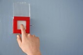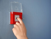 Młody człowiek, w pomieszczeniu za pomocą systemu sygnalizacji pożarowej