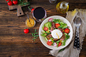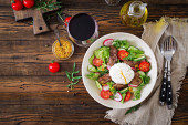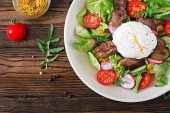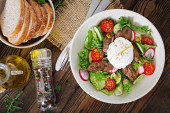 Zdjęcie "Widok z góry z sałatką z wątróbka drobiowa, rzodkiewka, ogórki, pomidory i jaj gotowanych" może być wykorzystywane do celów osobistych i komercyjnych zgodnie z warunkami zakupionej licencji Royalty-free. Obraz jest dostępny do pobrania w jakości wysokiej rozdzielczości do 5760x3840.