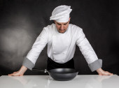 Czas gotowania szef kuchni. Kaukaski kucharz z misą ze stali nierdzewnej w ręce podczas przygotowywania posiłków.