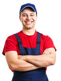 Pełna długość Portret mover rękami skrzyżowanymi na białym tle na białym tle