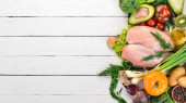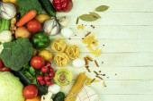 Zdjęcie "Zdrowe jedzenie. Warzywa i owoce. Na białym tle drewnianych. Widok z góry. Miejsce." może być wykorzystywane do celów osobistych i komercyjnych zgodnie z warunkami zakupionej licencji Royalty-free. Obraz jest dostępny do pobrania w jakości wysokiej rozdzielczości do 5760x3840.