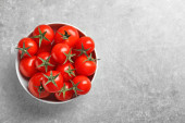 Świeże, dojrzałe pomidory na szarym tle, widok z góry