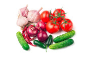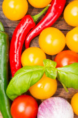 Świeże warzywa na białym tle drewnianych - pomidor, czosnek, pieprz, cebula.