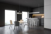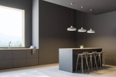 Blaty kuchenne białe z zabudowy AGD w czarna kuchnia wnętrz z drewnianą podłogą. Widok z boku. makiety 3D renderowania