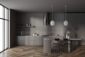 Zdjęcie "Blaty kuchenne białe z zabudowy AGD w czarna kuchnia wnętrz z drewnianą podłogą. Widok z boku. makiety 3D renderowania" może być wykorzystywane do celów osobistych i komercyjnych zgodnie z warunkami zakupionej licencji Royalty-free. Obraz jest dostępny do pobrania w jakości wysokiej rozdzielczości do 5760x3840.