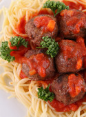 Zbliżenie, spaghetti Pulpety na widelec i danie na białym tle