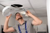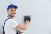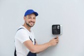 Zdjęcie "Technika instalacja kamery Cctv na ścianie w pomieszczeniu" może być wykorzystywane do celów osobistych i komercyjnych zgodnie z warunkami zakupionej licencji Royalty-free. Obraz jest dostępny do pobrania w jakości wysokiej rozdzielczości do 5760x3840.