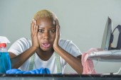 zdesperowany i podkreślił czarny afro American kobieta z kalkulatora i dokumentacji bankowej w stres rachunkowości Biznes Finanse Podatek i płatności w finansowy bałagan i koncepcja problem