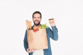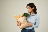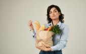 Portret kobiety uśmiechający się z papieru i pakietem spożywczy na białym tle