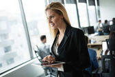 Atrakcyjna bizneswoman korzystająca z tabletu cyfrowego w nowoczesnym biurze
