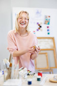 Kobieta, patrząc na kamery i siedzi w pobliżu Krosno w warsztacie Tkacz