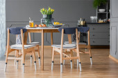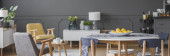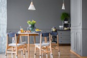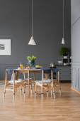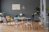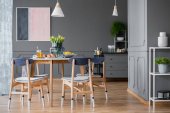 Wnętrza pokoi szary, różowy i niebieski obraz, drewniany stół i Komoda