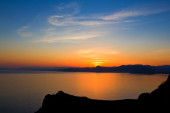 Fantastyczne i wspaniałe kolorowe pomarańczowy zachód słońca i refleksje z widokiem na wyspy w wodach Adriatyku wybrzeże z Dubrownik Chorwacja z sylwetki fotografów robienia zdjęć.
