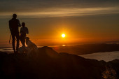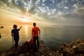 Fantastyczne i wspaniałe kolorowe pomarańczowy zachód słońca i refleksje z widokiem na wyspy w wodach Adriatyku wybrzeże z Dubrownik Chorwacja z sylwetki fotografów robienia zdjęć.