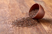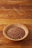 Kasza gryczana na podłoże drewniane, widok z góry, zbliżenie, selektywnej ostrości.