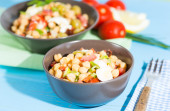 Zdjęcie "Sałatka z makaronem z jaj przepiórczych, mozzarellą, pomidorkami i kaparami w misce na fioletowym tle drewnianych. Selektywny fokus." może być wykorzystywane do celów osobistych i komercyjnych zgodnie z warunkami zakupionej licencji Royalty-free. Obraz jest dostępny do pobrania w jakości wysokiej rozdzielczości do 5760x3840.