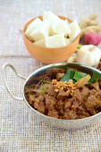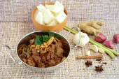 Rendang Padang, mięso wołowe curry, podawane z ciasta ryżowego lub lontong. Indonezyjskie jedzenie
