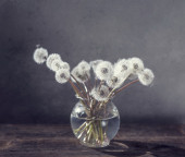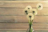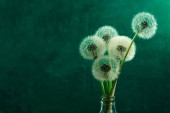 Pięć mniszek w butelce wazon. Piękny niebieski tło.