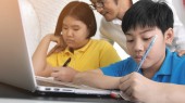 Azjatycki nauczyciel rozwija do ucznia w klasie biologii z mikroskopem .
