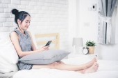 Młoda piękna kobieta z inteligentnych telefonów i filiżankę kawy, Online zakupy koncepcja.