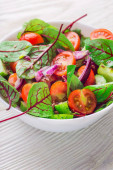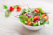 Świeże sałatki, zielone i fioletowe sałaty, pomidorów i ogórków na białym tle drewnianych z bliska. Zdrowa żywność.