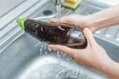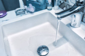 W kuchni przepływ wody z kranu do zlewu, pojęcie ekonomiczne wykorzystanie zasobów