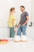 młody człowiek z filiżanki kawy siedząc na krześle i rozmawia z dziewczyna w kuchni