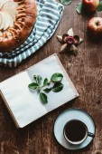 płaskie lay z kawałka jabłecznik, sztućce, pusty Notes i świeże jabłka rozmieszczone na powierzchni drewnianych