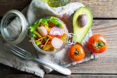 położyć płasko z Wegetariańska Sałatka, wyciąć awokado na pokładzie cięcia, nóż i świeże warzywa wokół na drewnianym blatem