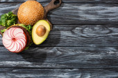 płaskie lay z sałatki wegetariańskie podawane na talerzu i świeżych składników, rozmieszczone wokół na drewnianym blatem