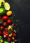 Koncepcja Tex-Mex, Nachos, Salsa sos, tło jedzenie, widok z góry